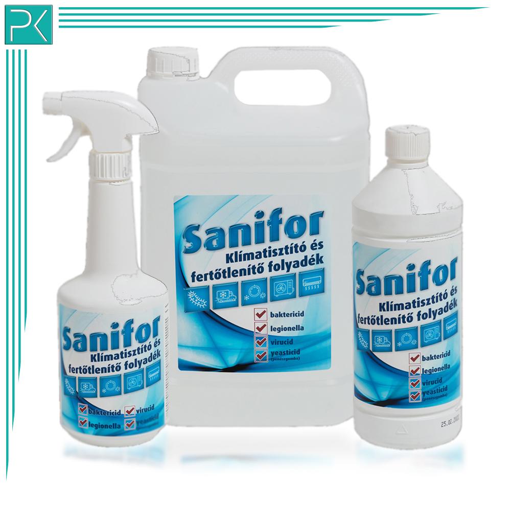 A Nemzeti Népegészségügyi Központ által engedélyezett Sanifor kiváló háztartási és ipari tisztító és fertőtlenítőszer. Alkalmas gépjárművek légkondijának a tisztítására, otthoni klímatisztításhoz, hőcserélők, párologtatók, kondenzátorok tisztítására, fertőtlenítésére, illetve hűtőkocsik raktereinek teljes tisztítására. A kiváló szíroldó hatásának köszönhetően gyorsan képes eltávolítani a szerves (vírusok, baktériumok és gombák) szennyeződést, és a speciális felületvéfő anyaga megakadályozza hosszú ideig a lerakódást a klímák lamelláin.